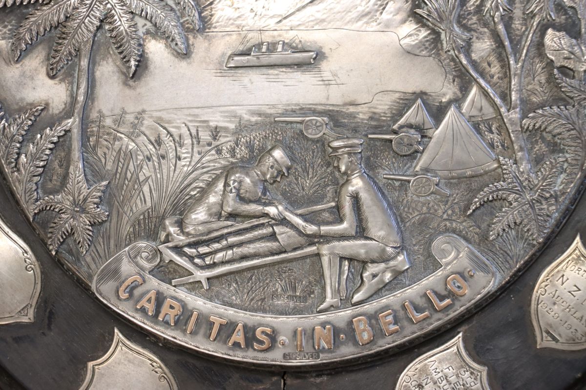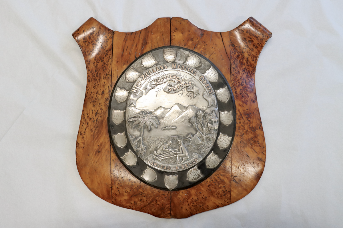 The ornate shield features a plaque of silver relief work mounted on ebony and tĆtara. The detailed scene depicts members of the New Zealand Medical Corps (the precursor to our modern Royal New Zealand Army Medical Corps) attending to a wounded comrade, surrounded by New Zealand flora. Out in a bay a warship is anchored in front of a background of mountains. Above the scene are two scrolls with the words âNew Zealand Medical Corpsâ and âChallenge Shieldâ. Below the two stretcher bearers is a scroll inscribed with the Latin âcaritas in belloâ which means âcharity in warâ. Surrounding the silver relief are mini-shields engraved with the details of the winning teams.
