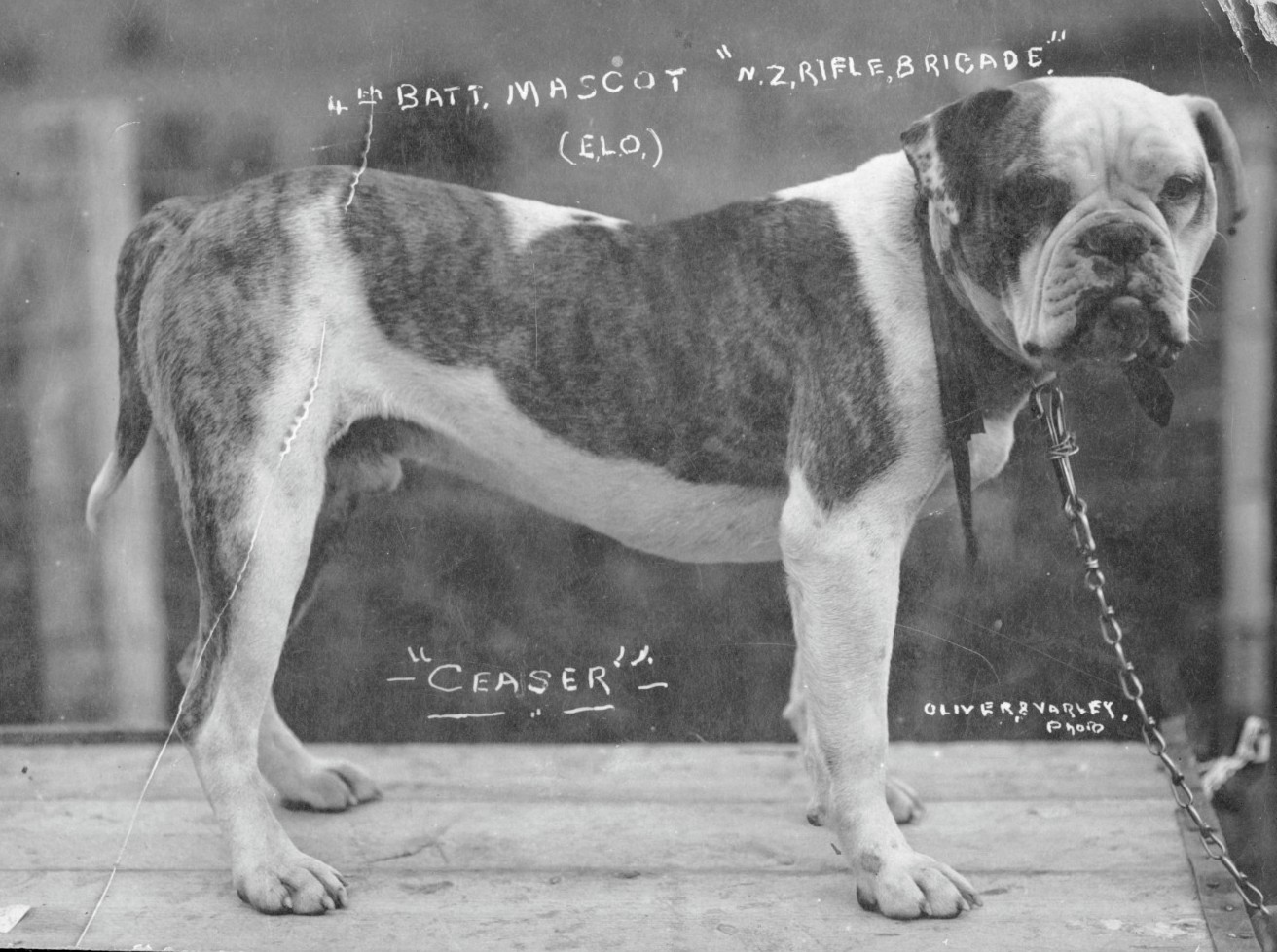 Ceaser was the official mascot of A Company, 4th Battalion, New Zealand Rifle Brigade during World War I. After taking part in an official parade with the troops down Queen’s Street in Auckland, he departed New Zealand for Egypt alongside his handler, Rifleman Thomas Samuel Tooman.